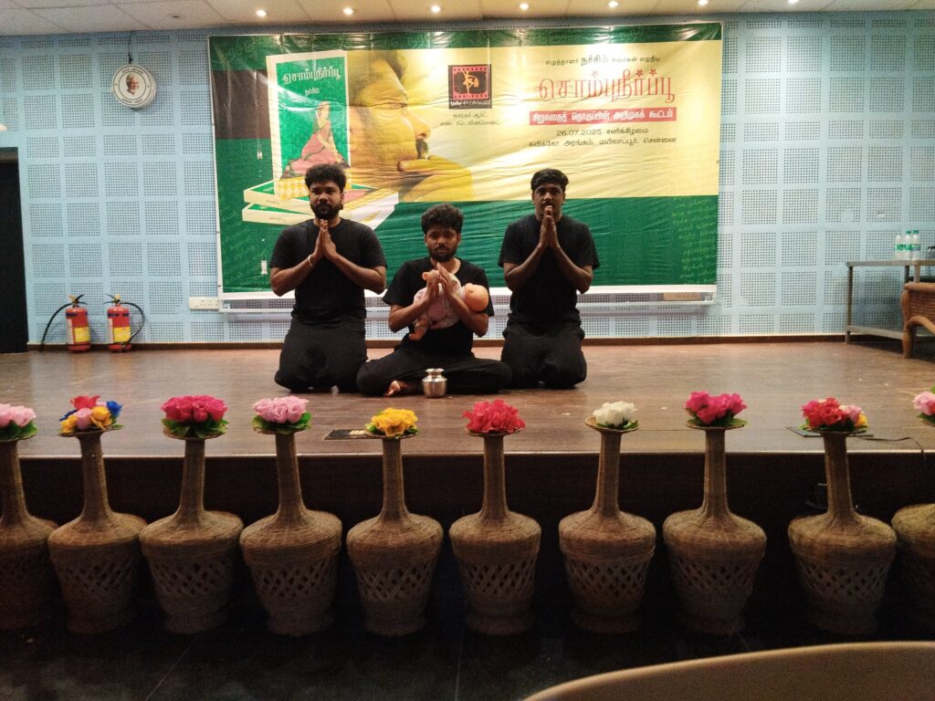 ஆனால் எப்படி, வீடு கட்டுவதையும் திருமண நிகழ்வையும் ‘outsourcing’ அல்லது ‘contract’ மூலம் செய்கிறோமோ அப்படி நூல் வெளியீட்டு விழாவையும் கச்சிதமாக செய்து கொடுக்க ஆள் இருக்கிறது என்பதே இலக்கிய உலகின் இன்பச்செய்தி. ஆம், லாந்தர் ஆர்ட்ஸ் & எண்ட்டர்ட்டெய்ன்மெண்ட் எனும் அமைப்பின் மூலம் கவிஞர் பாலைவன லாந்தர் & கோ இந்த சொம்புநீர்ப்பூ நூல் அறிமுக விழாவைத் திறம்படச் செய்து கொடுத்தார்கள். மேலே இருக்கும் பத்திகளில் இருக்கும் அத்துணை செயல்களையும் மிக நேர்த்தியாகச் செய்து, எல்லாவற்றையும் ஒரு நாள் முன்னரே கச்சிதமாக முடித்து, விழாவில் எந்த சிறு சுணக்கமும் ஏற்படாதவாறு ஒருங்கிணைத்து முடித்துக் கொடுத்தார்கள். அத்தோடு நில்லாமல், இந்த விழாவில் இதைச் செய்தால் நன்றாக இருக்கும் எனும் options தந்தார்கள். இதுதான் ஒரு தொழிலின் value added. அப்படி அவர்கள் கொடுத்த யோசனைதான், திணைவாசிகளின் நிகழ்த்துக்கலை. மிக அற்புதமான நிகழ்த்துகலைஞர்கள் சொம்புநீர்ப்பூ சிறுகதையை மிக உயிர்ப்பாக நிகழ்த்தி அரங்கத்தை அசர வைத்தார்கள்.