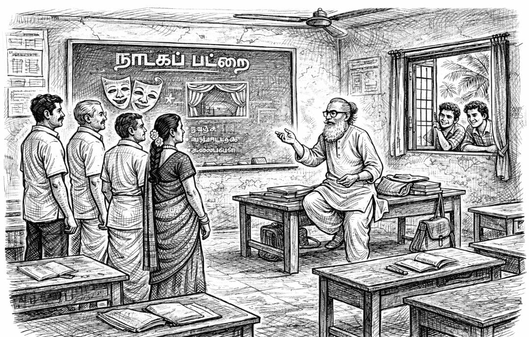 நாடகங்களை எழுதி இயக்கி அரங்கேற்றுவதுதான் அய்யாவின் தீராத மோகம். நாடகங்கள் என்றால் “அடடே டாக்டரே வந்துவிட்டாரே” போன்ற லெளகீக நாடகீயங்களோ, “ப்ரபோ, என்னை நீங்கள் அப்படிச் சொல்லல் ஆகாது ஸ்வாமி” போன்ற புராணக்கதைகளோ பாகவதர் நாடகங்களோ கூடவே கூடாது என்று தீர்மானித்து, மிக ஆக்கப்பூர்வமாக, அறிவைத் திருகும் நாடகங்களாக ஆக்கி மக்களை விழிப்புணர்வு அடையச் செய்வதே நோக்கம். அதுதான் கலையின் உன்னதம் என்ற அய்யாவின் கருத்தை ஏற்றவர்கள் சேர்ந்து உருவாக்கியக் குழு.
